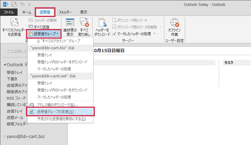 アカウントを削除しないで、送受信を一時停止したい場合は以下の設定をします。1.上部タブの「送受信」を選択し、「送受信グループ」>「送受信グループの定義」をクリックします。