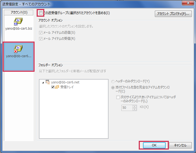 3.停止するアカウントを選択した状態で「この送受信グループに選択されたアカウントを含める」のチェックを外して、「OK]ボタンで完了です。