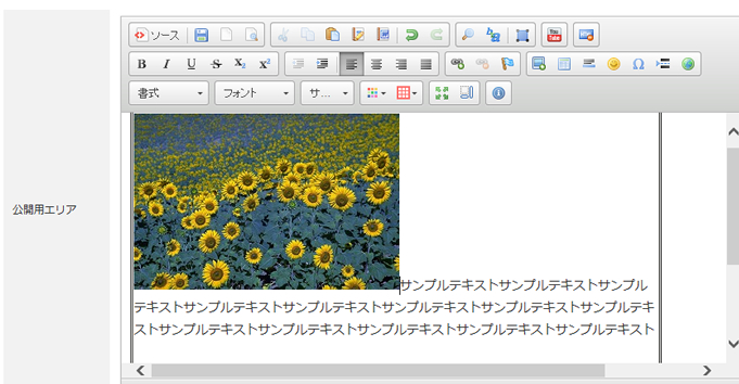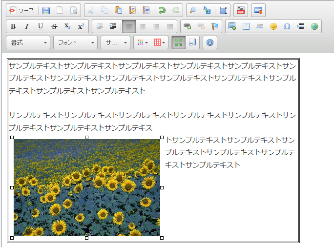 行揃えを「右」にすると画像が右端に配置され、テキストは左側に廻りこみます。