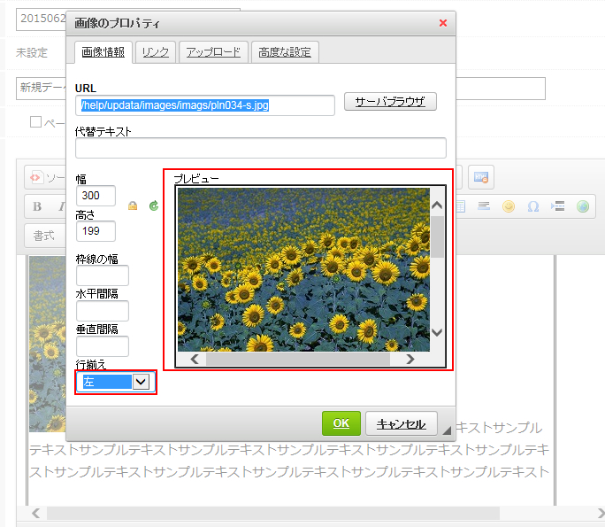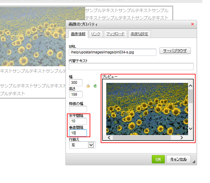 これを補正するには画像を挿入する際の「画像プロパティウィンドウ」から設定します。