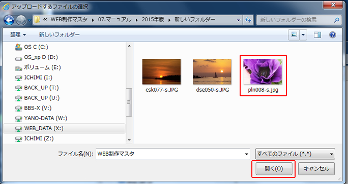 パソコン内の目的の画像フォルダを開き、ファイルを選択して「開く」ボタンをクリックします。