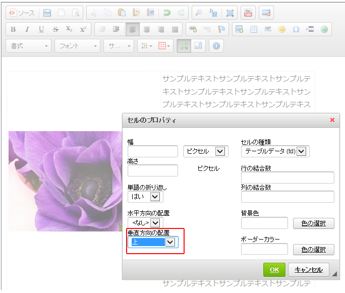 ※「垂直方向の配置」とは画像いやテキストの位置が「上、中央、下、ベースライン」の縦位置に配置する。