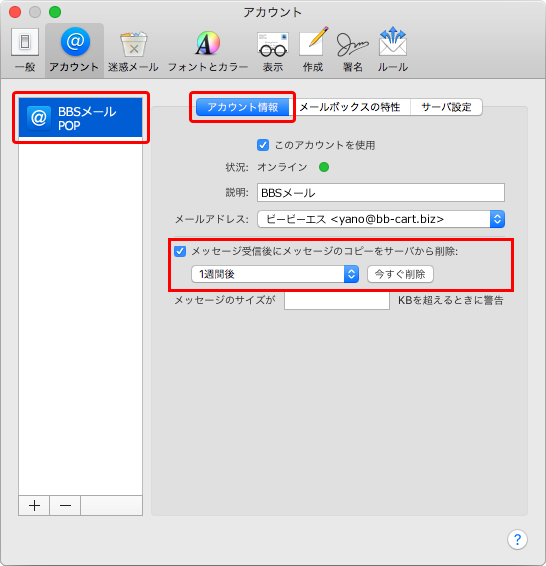 6.左のアカウントリストから該当のアカウントを選択し、「アカウント情報」内の「メッセージ受信後にメッセージのコピーをサーバーから削除」にチェックを入れます。