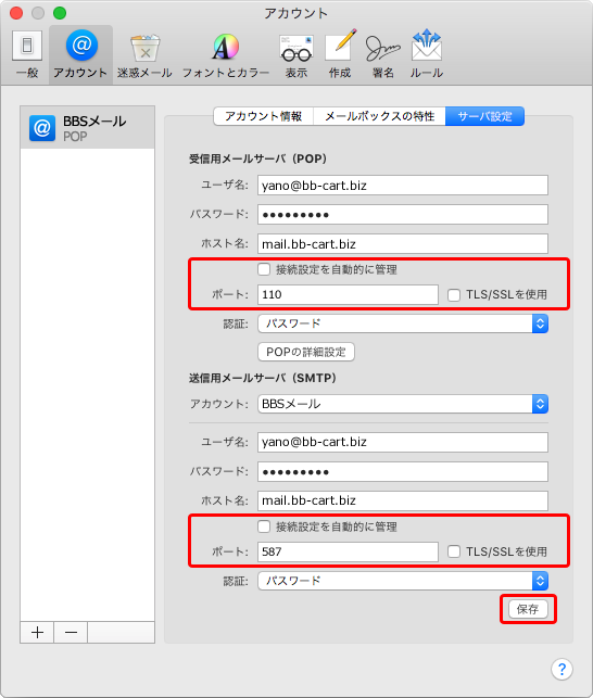 | サーバーのアドレス | : | mail.bb-cart.biz |