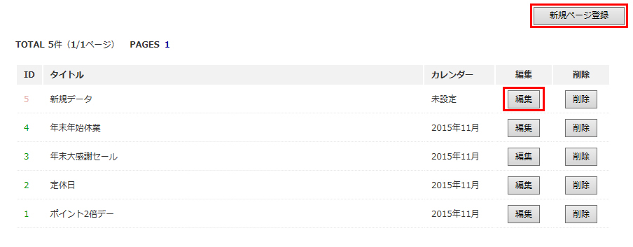 イベントカレンダー機能はオプションです。1.イベントリストの右上「新規ページ登録」をクリックして新規データを追加し編集画面に移動します。