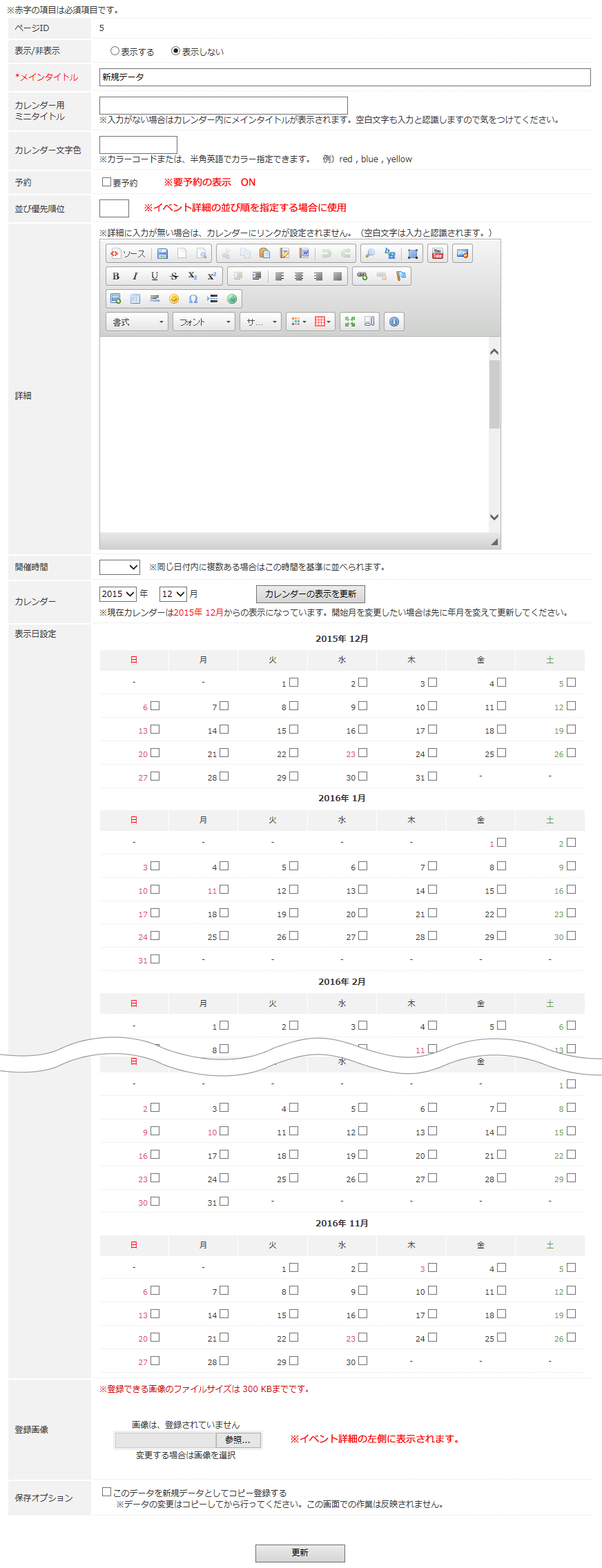 2.「タイトル」「詳細」「表示日」などを設定します。