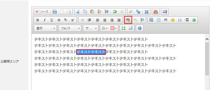 リンクを設定するテキスト(または画像)を選択してツールバーの「リンク挿入/編集」をクリックします。