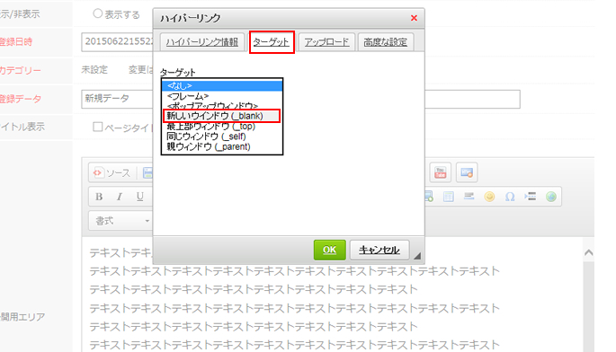 次に上部の「ターゲット」タブを選択し、「ターゲット」の項目から「新しいウィンドウ[_blank]」を選択して、「OK」をクリックします。