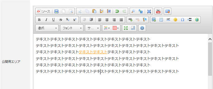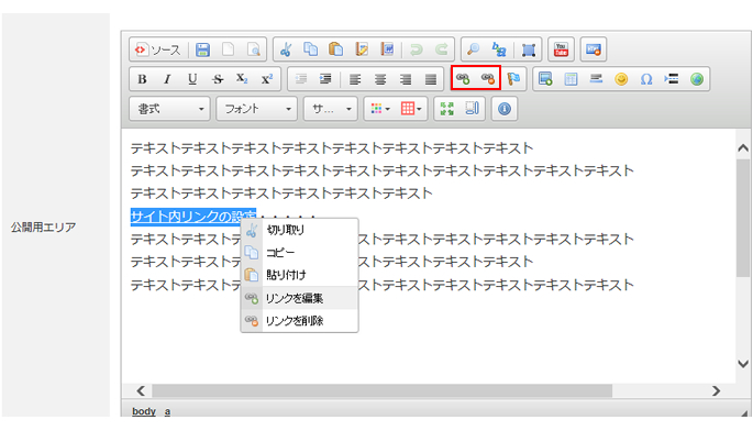 リンクを設定するテキスト部分(又は画像)を選択状態にし、「リンクの挿入/編集」ボタンをクリックします。