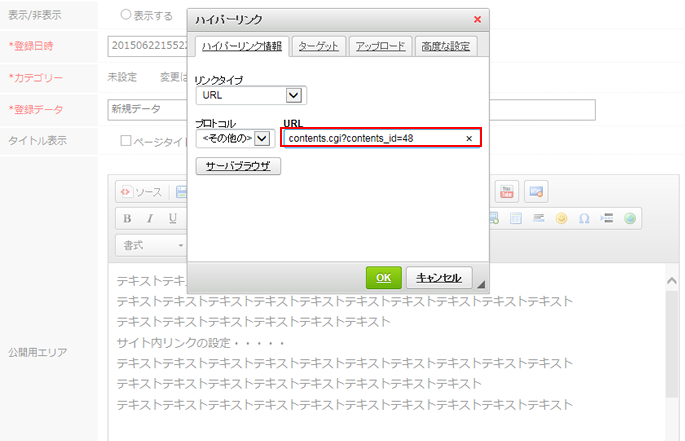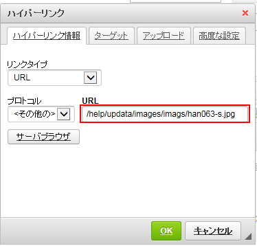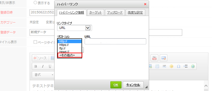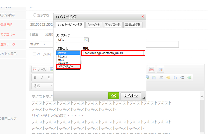 サイト内リンクの場合は、ハイパーリンクウィンドウでプロトコルを「その他」に設定し、「URL」に該当のページアドレスを入力します。
