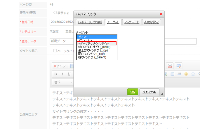 ターゲットは「新しいウィンドウ」か「ポップアップウィンドウ」を選択して設定します。