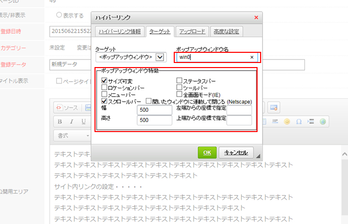 一般的には「ポップアップウィンドウ名」(半角英数字)、「リサイズ可能」「スクロールバー」「幅」「高さ」の項目を設定すると良いでしょう。