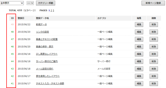 最後の「 48 」にあたる数字は、管理画面のページ一覧に表示されている「 ID番号 」です。(下図参照)