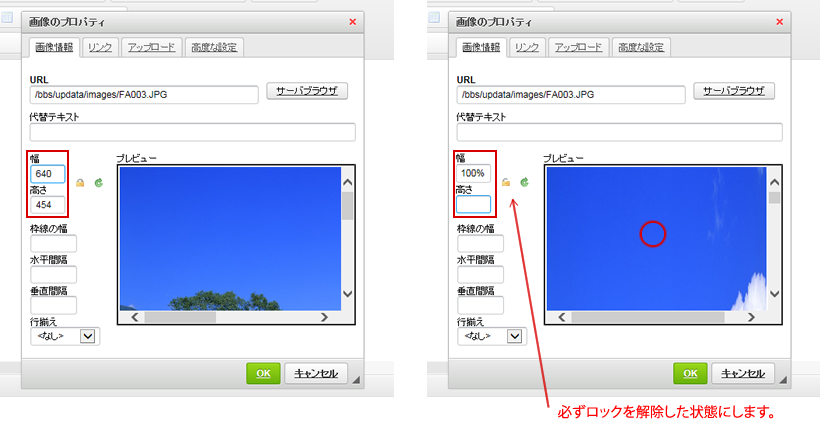 ●画像の設定の際、横幅サイズは「 % 」で指定します。※重要事項です!!